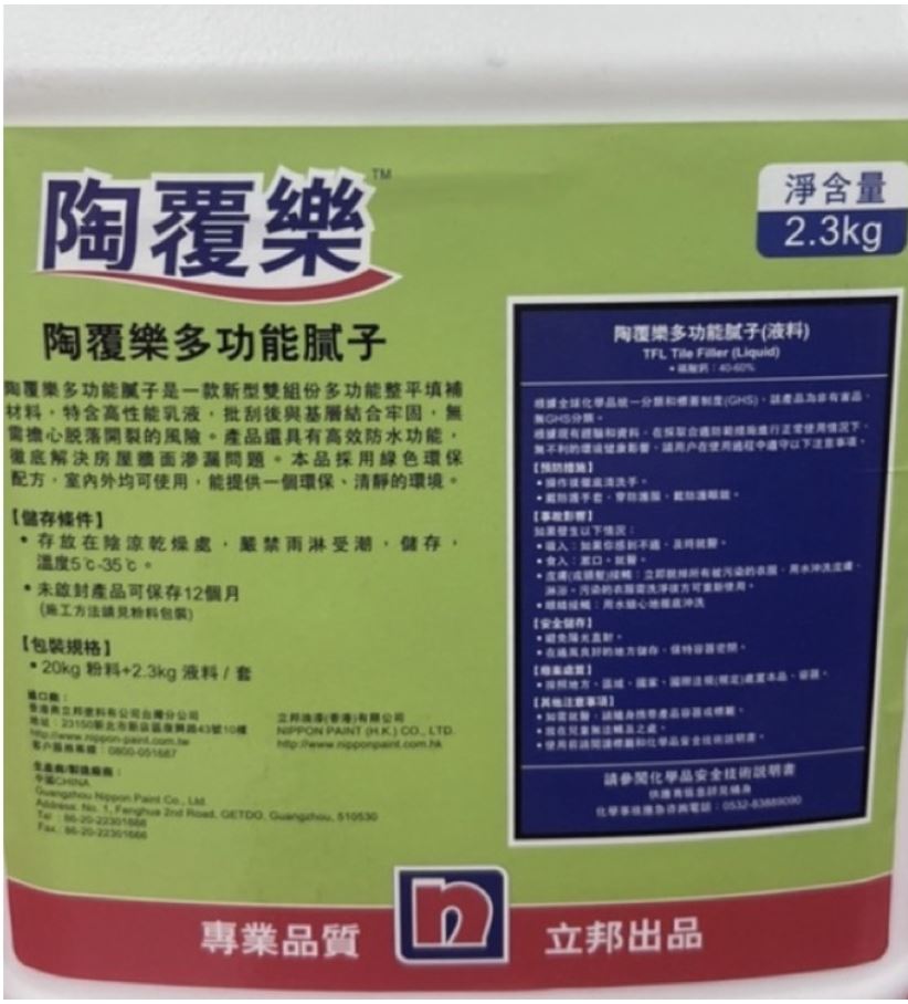 立邦陶覆樂多功能膩子是一款創新的雙組份多功能填補材料,特含高性能乳液結合高附著力、高耐用性材料製成。批刮後與基層結合牢固,無須擔心脫落開裂的風險。同時具有高效防水功能,徹底解決房屋牆面滲漏問題。採用色環保配方,為您打造健康環保居家環境。